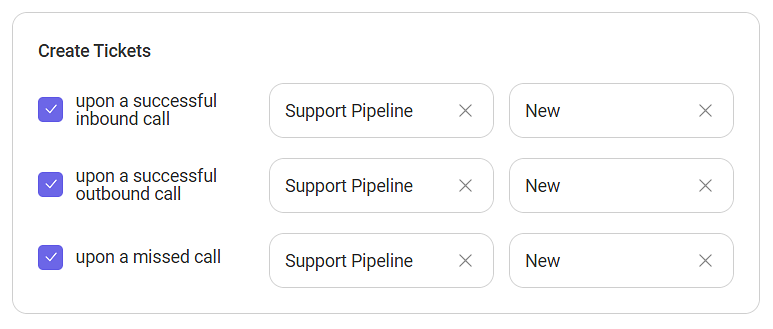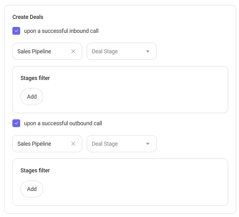 On Successful Inbound Call - Select the sales pipeline and stage for creating a deal on successful incoming calls by default. Deal Creation Conditions - In this setting, you can specify conditions for creating deals in a specific pipeline and at a specific stage.